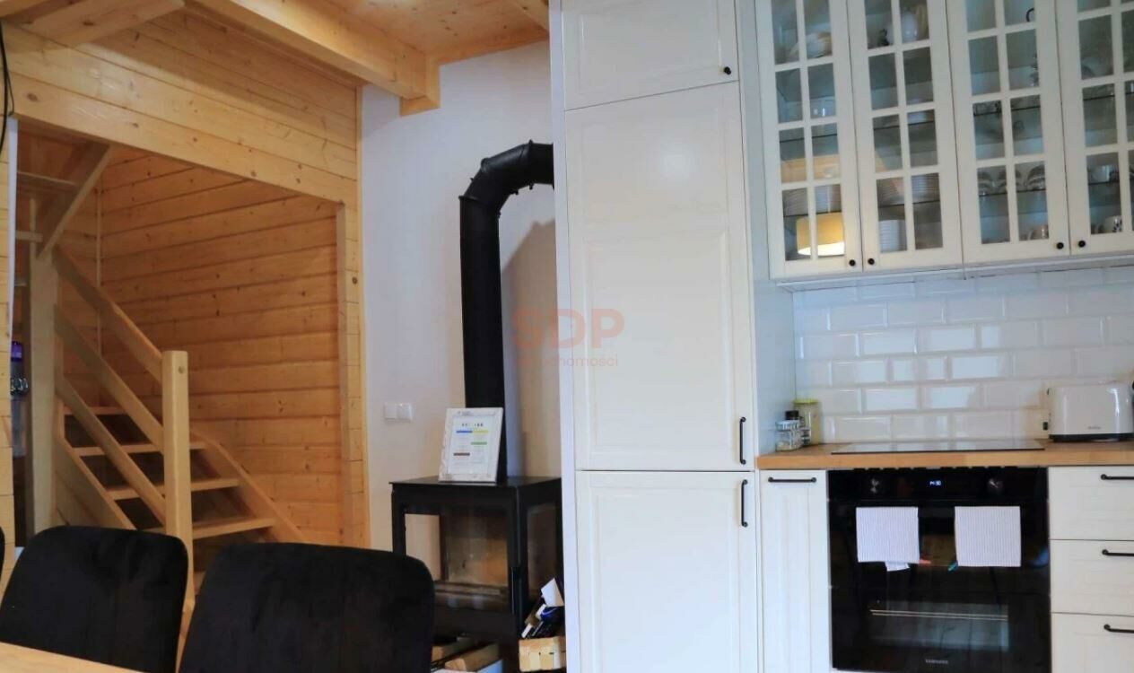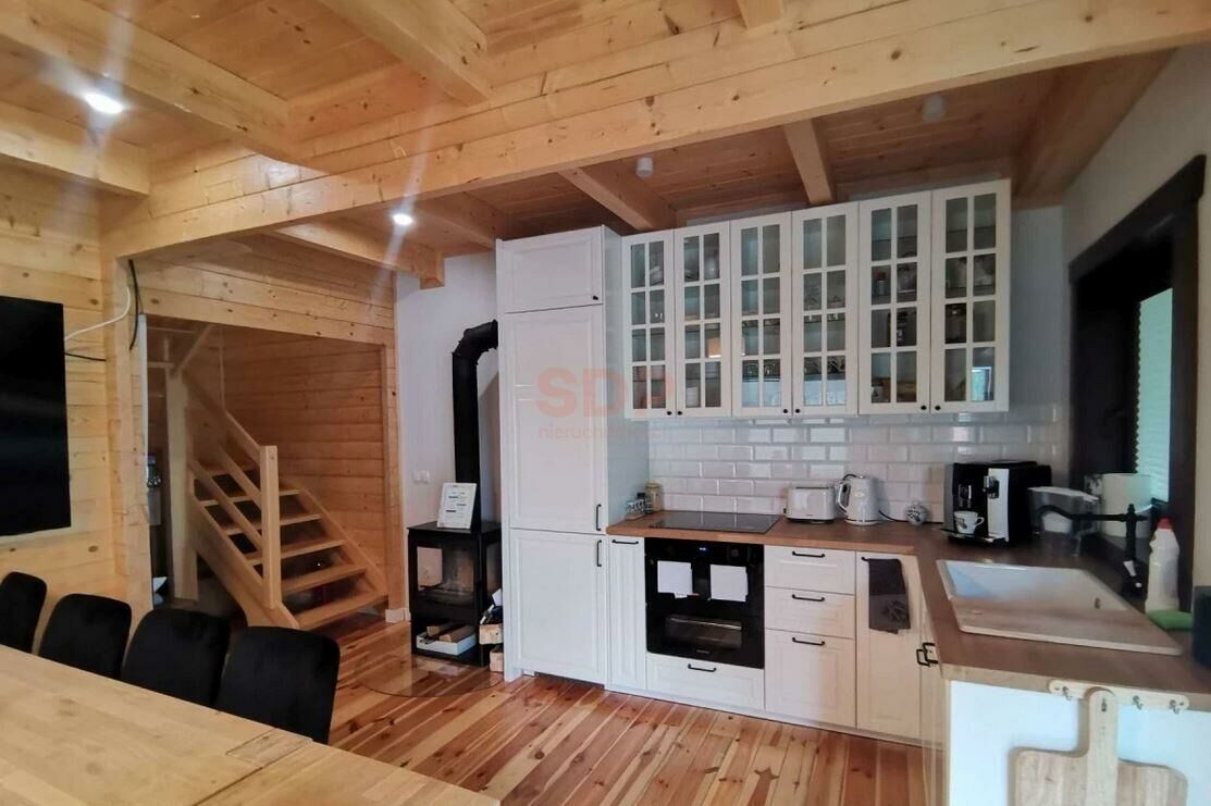 -dom w całości wykończony naturalnym drewnem wysokiej jakości, (schody, balustrady, elementy boazerii), na podłogach drewniana podłoga.